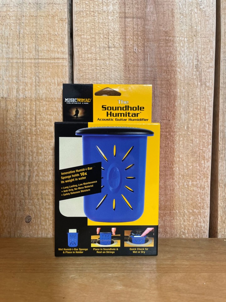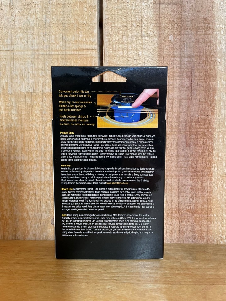 "Acoustic guitar wood needs moisture to play and look its best. A dry guitar can warp, shrink and worse yet, crack! MusicNomad, the leader in equipment care products, has developed an easy to use, no mess, and low maintenance guitar humidifier. The Humitar safely releases moisture evenly to eliminate these potential problems. Our innovative Humid-i-Bar sponge holds a lot more water than our competition. This means less monitoring on your end while resting assured your fine guitar is being cared for. Time to check the Humitar? Easy! Pop the top, touch the insert; if it’s wet leave it, if it’s dry, it’s time to rehydrate. Rehydrating is a cinch – simply remove the Humid-i-Bar sponge, soak it in distilled water and you’re back in action – easy no mess and low maintenance."-from the Music Nomad website