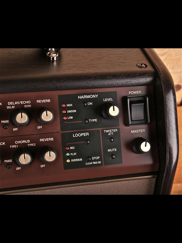 - PAD Button, ACOUSTIC RESONANCE Button, VOLUME Knob, BASS Knob, MIDDLE Knob, TREBLE Knob, ANTI-FEEDBACK Knob, PHASE Button, CHORUS Knob, REVERB Knob Guitar controls