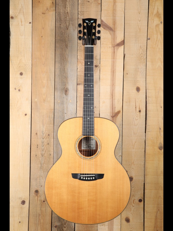 When we special ordered this guitar years ago, it was designed to be a big guitar for a big man (but a very sweet big man, who will be missed!). It was his dream guitar; and, when it arrived, it was clear that James Goodall had hit the mark like Robin Hood, as the dream was now a reality. This Goodall Koa Jumbo comes just about as close as one can to being a piano squeezed into a guitar-sized box, albeit a very large guitar-sized box as guitar-sized boxes go. As a super jumbo, this KJ has tremendous breath of tone and power, which create a commanding presence so three dimensional that it inspires one to climb inside the guitar and listen to the notes bounce around with cavernous echo. Indeed, in such a space, it seems one can get lost for days in the ringing sustain before they realized they were out of food and water and needed to find their way out of the cave back to loved ones and, perhaps, a job. Thanks to Goodall’s inherently bright voicing, the guitar has a beautiful shimmering treble and remains surprisingly balanced, while retaining a good deal of clarity in the mid-range. Whether used for strumming or fingerstyle applications, the player is at the helm of an extremely dynamic and spacious voice.