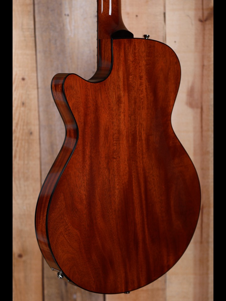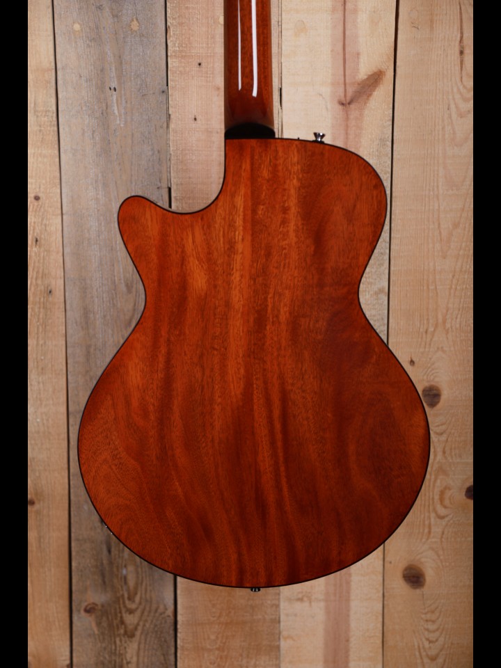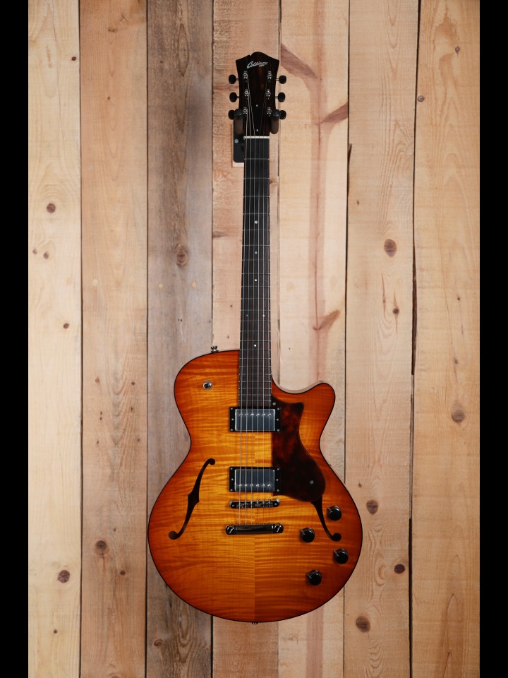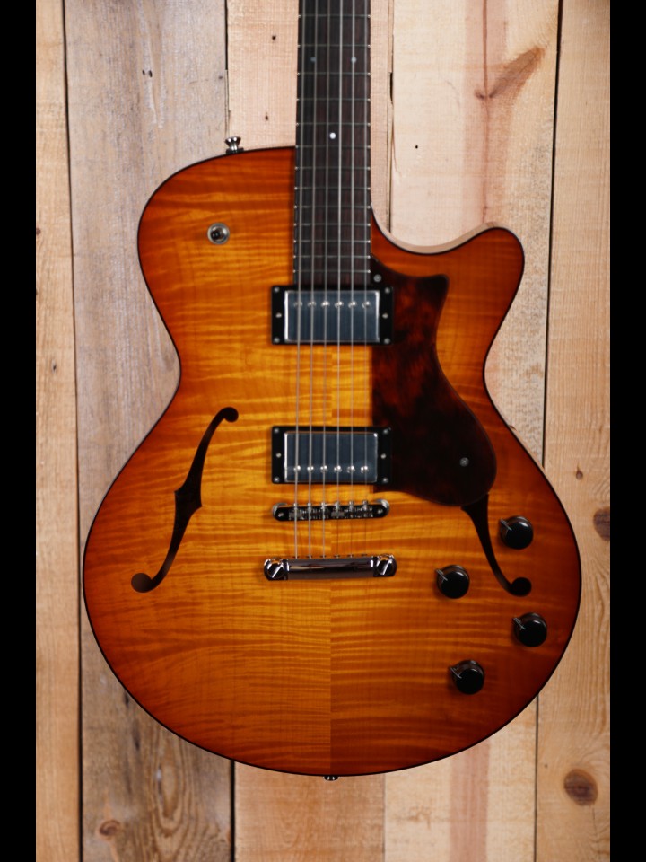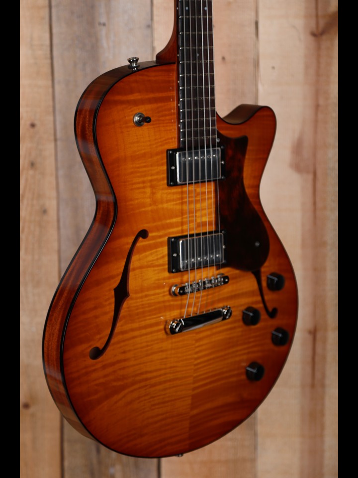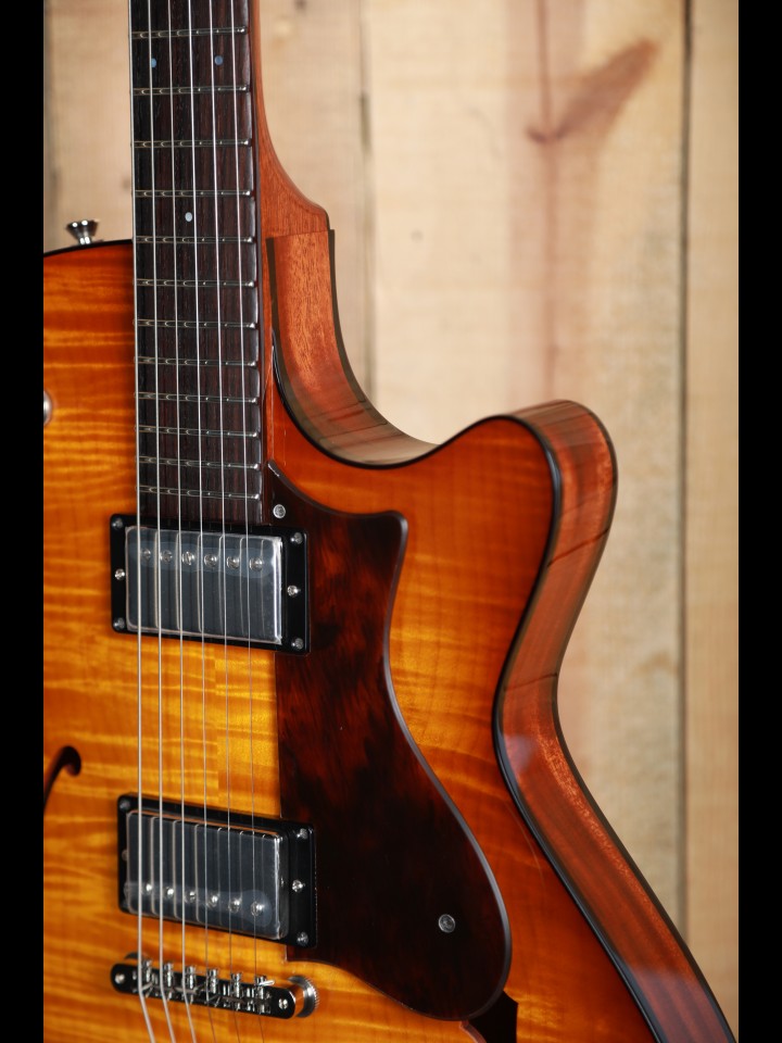 ”The 620 is tailor made for guitarists who value both nuance and punch. Featuring a flamed maple top, 15/8” Honduran mahogany body, and solid maple center block, it blends the resonance of a semi-hollow with the artistic execution of a carved archtop.