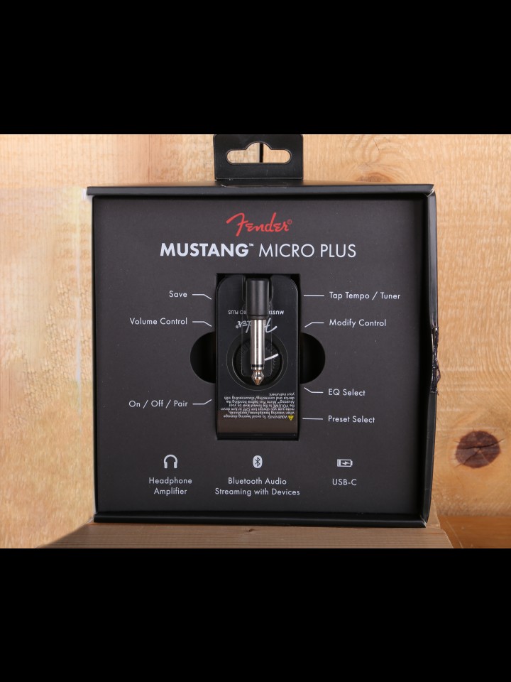 “Mustang Micro is a complete personal guitar amplifier featuring a wide selection of tones from the wildly popular Mustang series amps. Plug Mustang Micro directly into your guitar, connect your favorite wired headphones, and choose your perfect amp and effect settings. It’s ideal for any player from beginner to pro, making it quick and easy to get great tones when jamming at home or on the go. Mustang Micro’s 1/8” stereo headphone out allows the flexibility to use your favorite wired headphones or earbuds and silently play with a responsive touch and feel without annoying latency. Want to jam along with tunes from your music library or favorite streaming service? Mustang Micro supports Bluetooth audio streaming from your mobile device, tablet or computer to Mustang Micro and features automatic Audio/Visual sync, making it a great tool for practicing and learning songs. And you can even record your favorite guitar tones and the Bluetooth audio stream simultaneously using Mustang Micro’s USB-C output. It’s the ultimate guitar karaoke machine!" -From the Fender website.