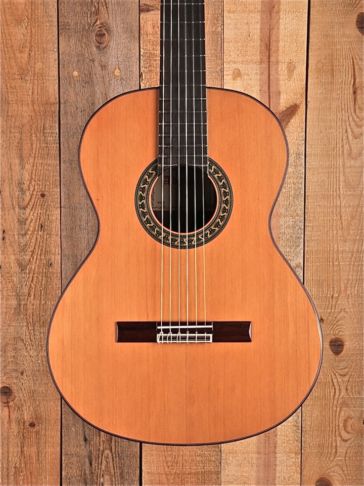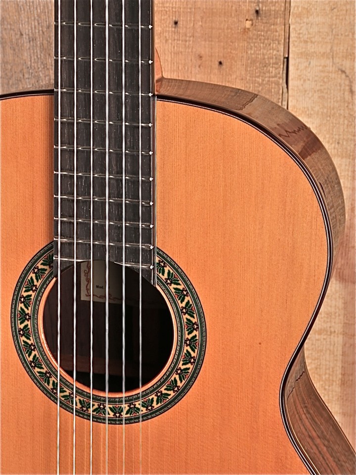 Alhambra guitars are among some of the most well respected nylon string guitars in our inventory. They are known for their rich, full sound with great midrange articulation. The 5P model is no exception to these accolades. The rosewood back and sides provide this instrument with a pleasant tonal profile, highlighting the lows and highs of the guitar. This helps to provide a strong note foundation along with articulate high end. Rosewood combined with the guitar’s solid red cedar top creates a wonderful balance, given that the cedar errs more towards a warmer tone and fills in the midrange quite nicely.